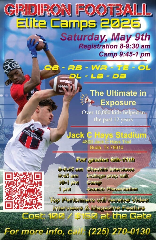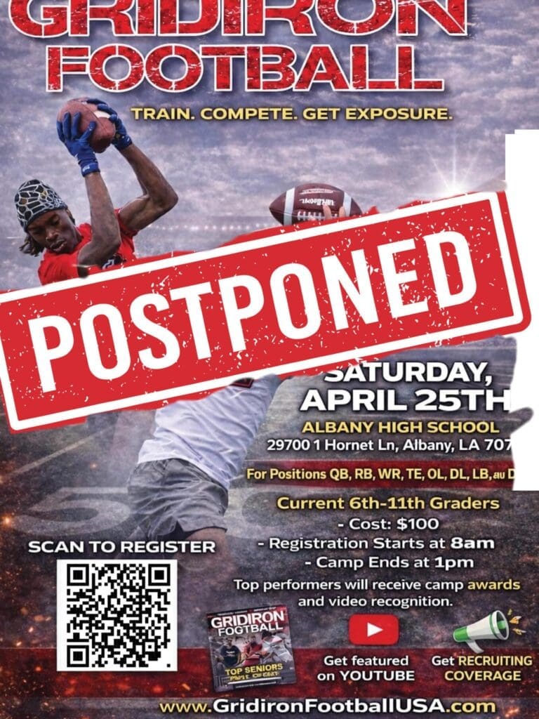 Each month, Gridiron Football tries to put on at least two camps and there was going to be an attempt to host a camp at Albany High School on Saturday, April 25th, but due to bad weather and sloppy field conditions, the camp had to be postponed to Saturday, May 23rd. The 30 players that were there did get interviewed and have received their camp shirts for the May 23rd camp. There were even a couple of players that received invitations to play in the 2026 Gridiron Football All-American Bowl Game based on their film. Those players are East Ascension OL Ledaveon Curry, Covington OL Alex Hughes, U-High RB Corbin Odell, Pearl River TE Davyn Keicher, Covington DB Cameron Johnson, Ponchatoula DL William Walker, Fontainebleau DL Kenneth Primus, and Walker TE/DE Nathan Ray. Every player that registered for the camp will have their credit towards May 26th.