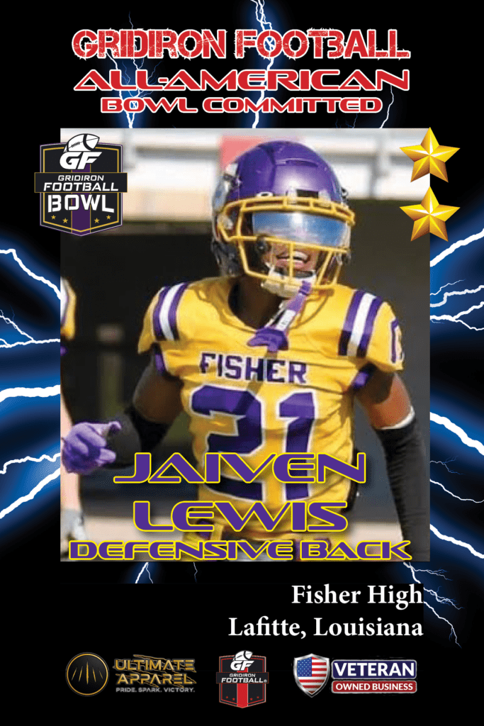 Fisher High School (Lafitte, LA) safety Jaiven Lewis has committed to play in the 2024 Gridiron Football All-American Bowl Game.