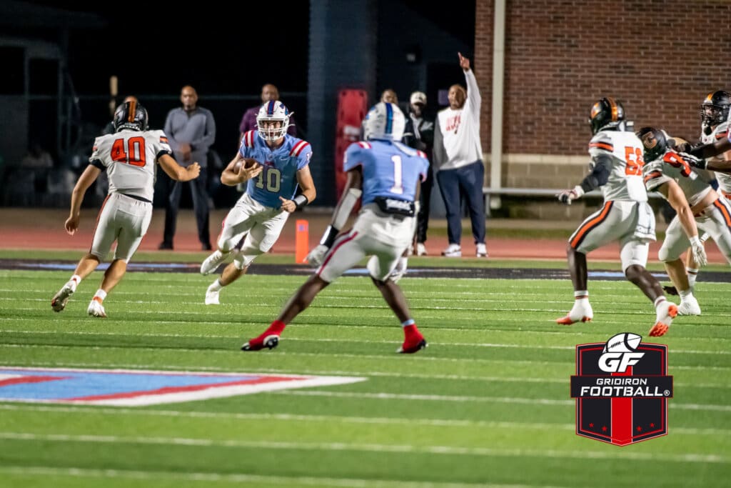 Zachary High School quarterback Eli Holstein makes an impressive play on third down navigating through the pocket, going to outside of the pocket, and finds junior wide receiver Tyson George for a 21 yard pickup on the run.
