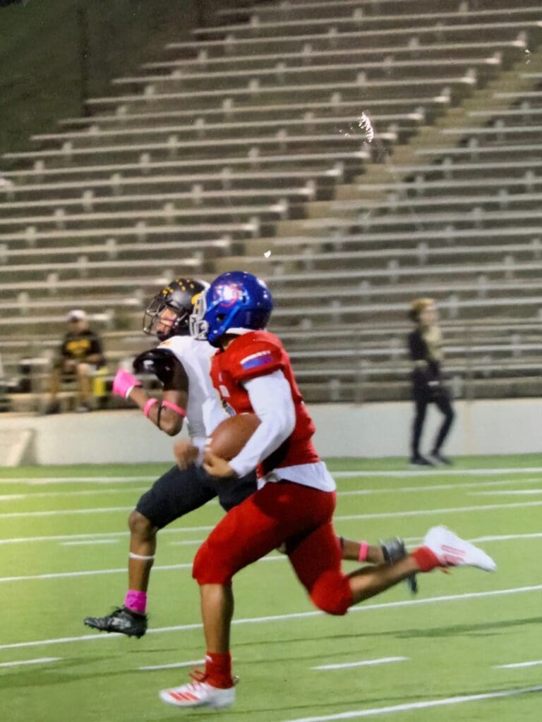 Jalil Brown is an electrifying athlete. Playing quarterback and running back, he has the ability to move the ball down the field. Jalil has good speed, above average lower body strength, and he has great game speed vision with finding holes in the defense. In his game vs Garland, Tx, (where he was named Player of The Week) Jalil scored Touchdown after Touchdown even with 10 defenders trying to bring him down. Last season, in only his Sophomore campaign he carried the rock for 1215 yards averaging 8.1 yards per carry with 7 touchdowns. He also passed for 438 yards with 6 touchdowns. Jalil had 1690 total All-Purpose yards and was named to 10-6A 2nd Team All-District as well as Team MVP in only 8 games in 2019. After speaking to him, Jalil is a soft-spoken young man that has just been accepted into the National Honors Society with a 3.5 GPA.