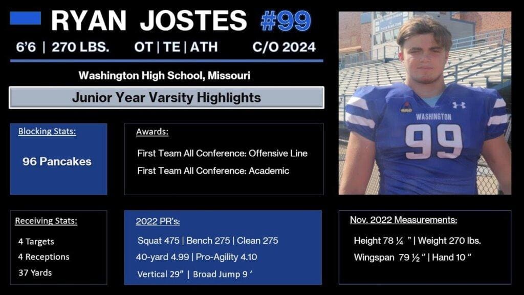 Ryan Jostes is a three-star offensive tackle for the Washington Blue Jays in Washington, Missouri. The 6’6” 280lbs lineman uses his body to get in the opponent’s way and bullies them in the direction he chooses. The senior will not stop irritating his opponent until the whistle has finally blown. This run-dominant lineman is fantastic at breaking into the second level and helping the running back find holes they need to get a huge gain. Ryan is committed to playing at Missouri next year in 2024.