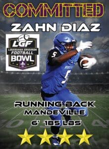 Zahn Diaz is a 4 star Running Back out of Mandeville High School (Mandeville, LA)and current commit to the 2019 LGF All-Star game held at Louisiana College. Diaz has a current GPA of 3.3 and an ACT score of 22. Coming into his senior year, Zahn posts a bench press of 305lbs with a squat of 500lbs. Talking with Zahn, he told me that he first found a love for football through his older brother. At a very young age, Zahn’s brother would use him as a practice tool, throwing him around the yard and making Zahn try to tackle him. Because of this fierce competitiveness and aggressiveness, Zahn said he immediately took a liking to the sport and could not wait to start playing for real.