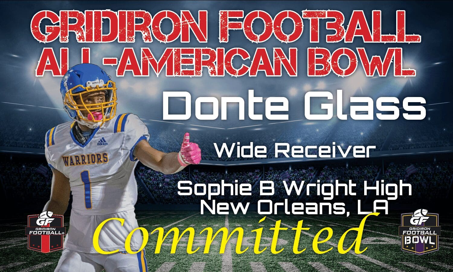 Donte Glass is first of five players from Sophie B. Wright High School to be committed to play in the Gridiron Football All-American Bowl Game. Donte is a 6’2, 182 pound wide receiver with 4.6/40 speed and also plays in the secondary too at cornerback for the Warriors. Being a two way player for the Warriors, Donte shows great ball skills and has the knack for making the big play. In the classroom, Donte is a good student, who has a 3.2 GPA and a 18 on his ACT. Donte has earned the right to play in the Gridiron Football All-American Bowl Game and is excited to show what he can do on December 30th.