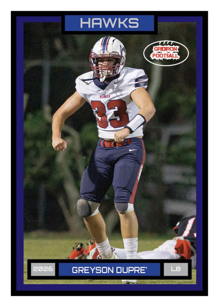 Greyson Dupre is a talented linebacker/punter for the Archbishop Hannan Hawks. At 6’0, 190 pounds, Dupre was a tackling machine last season for the Hawks with 112 total tackles (58 solo), 6 TFLs, and three forces fumbles earning 2nd Team All-District honors. He was equally impressive when he had to punt the football by averaging close to 40 yards per punt with a long of 55 yards. Dupre, who has a goal of beating the school’s all-time single season tackle record, is having quite an impressive offseason heading into his senior season with an offer from Millsaps College and an Elite Camp Performance for Gridiron Football at Lamar Dixon Expo Center. Along with having a 3.8 GPA in the classroom, Greyson Dupre is also a standout soccer player for the Hawks earning goalkeeper of the year honors.