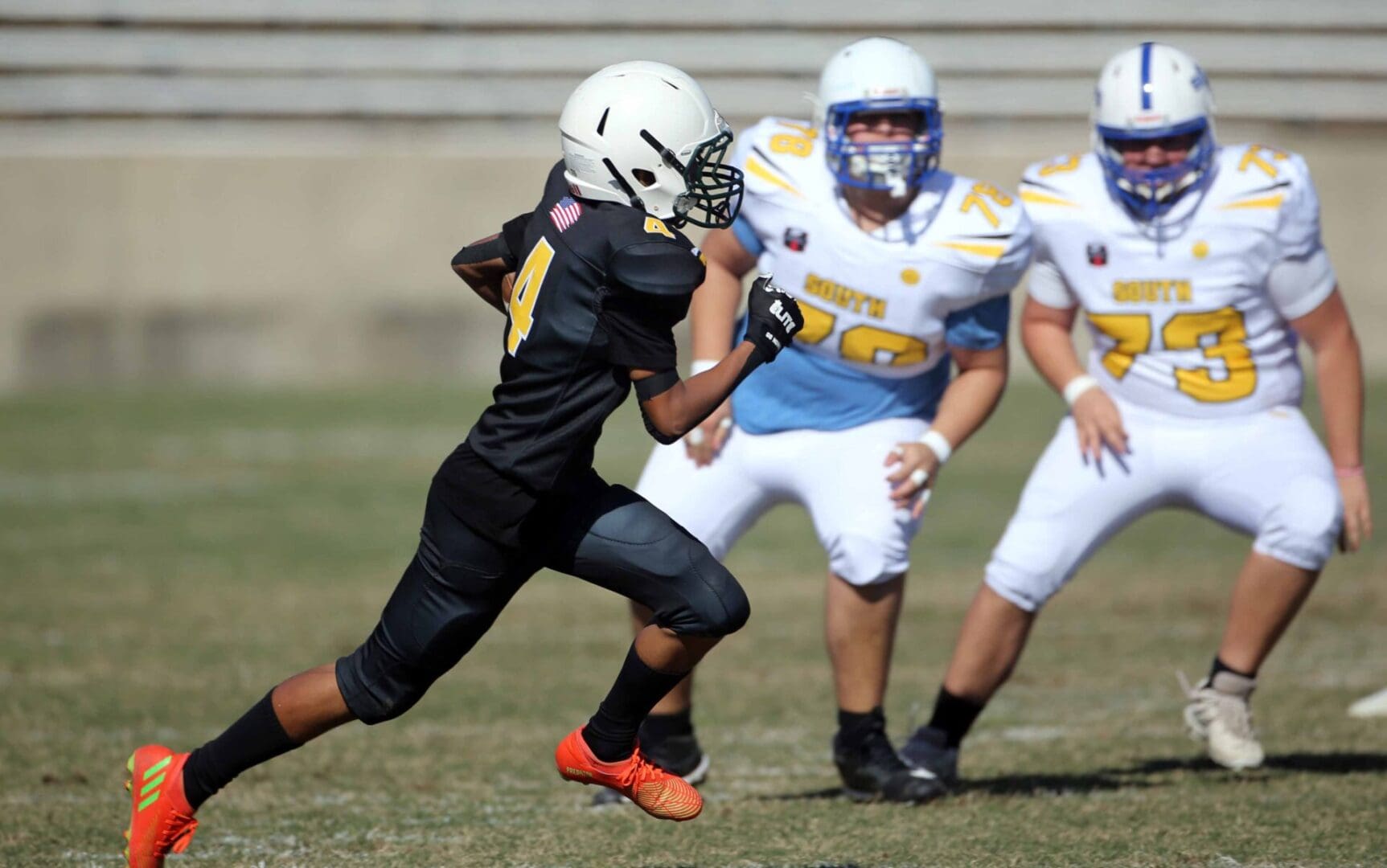 He had the longest play of all of the Junior High games, a sensational 86 yard catch and run that went for an unbelievably impressive touchdown. That one highlight showcases everything that Javeon brings to the table as a playmaking athlete. His footwork, agility, and acceleration are great for his age, and his contact balance is very impressive for only being 5’6″ 115 pounds. Then, once he finds any open space, he breaks away with his speed, completing the incredible touchdown that he scored for Team North.