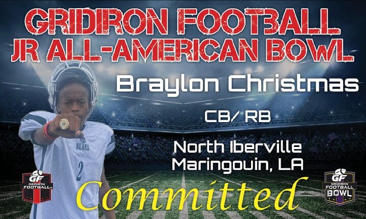 Braylon Christmas is a 5’8 130 pound athlete out of North Iberville high school in Maringouin, Louisiana. Braylon is a quick and shifty player that utilizes his skills for running the ball at running back as well as locking down receivers at cornerback. Christmas recently showcased his talents last month at Gridiron Football USA’s Junior Varsity bowl game.