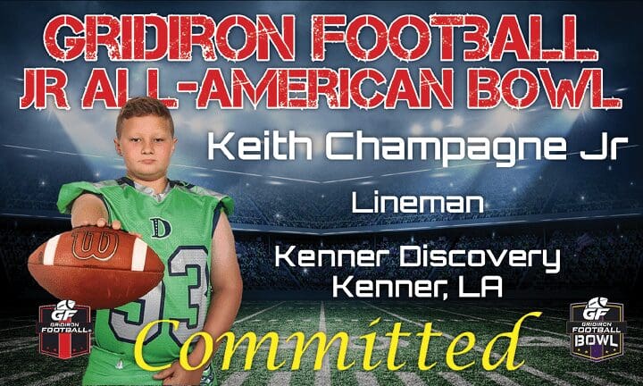 Keith Champagne is a determined, 14-year-old football player for Kenner Discovery in Kenner, LA. Keith is a 5’3″ 160 lb Center and Defensive Lineman. He squats an impressive 205 lbs and benches 115 lbs. Keith also runs a 6.50 40-yard dash.