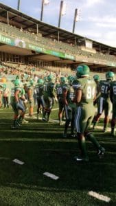 My personal favorite highlight from the game was Tulane’s field entrance. As the players poured onto the field in their green pants, green jerseys, and green helmets, the Wave’s number 11, Johnathan Brantley, a Houston native, held a Texas flag to display the team’s support of millions that were affected by Hurricane Harvey. Senior cornerback Parry Nickerson carried the #18 flag, representing the jersey number of Devon Walker, a former Tulane football player who was injured and paralyzed during a 2012 game. Really thoughtful gestures and noble acts from the Green Wave!