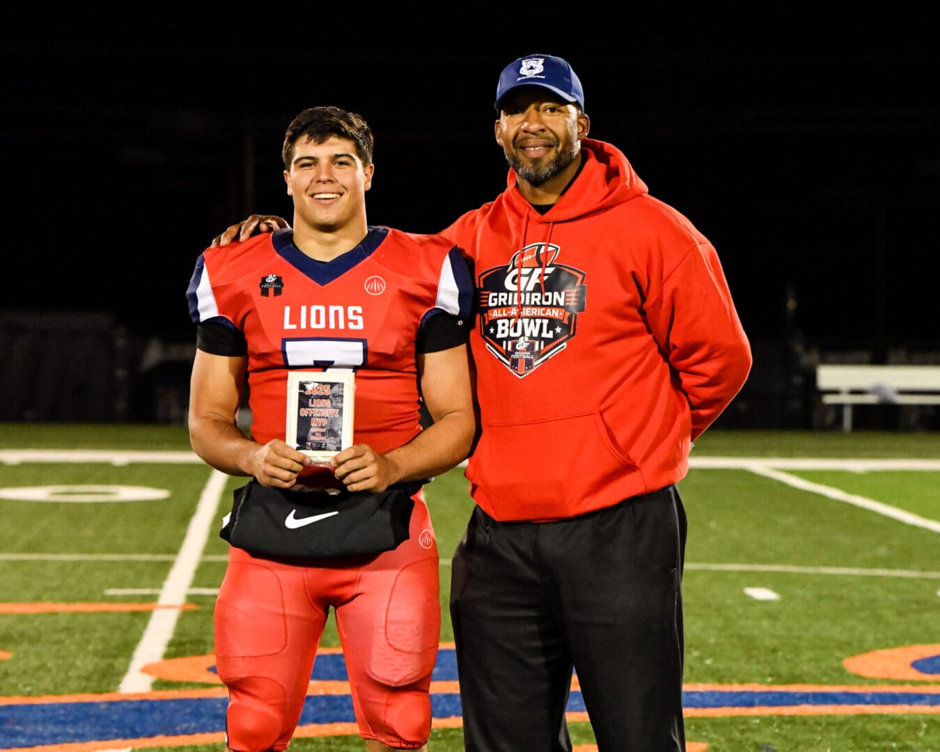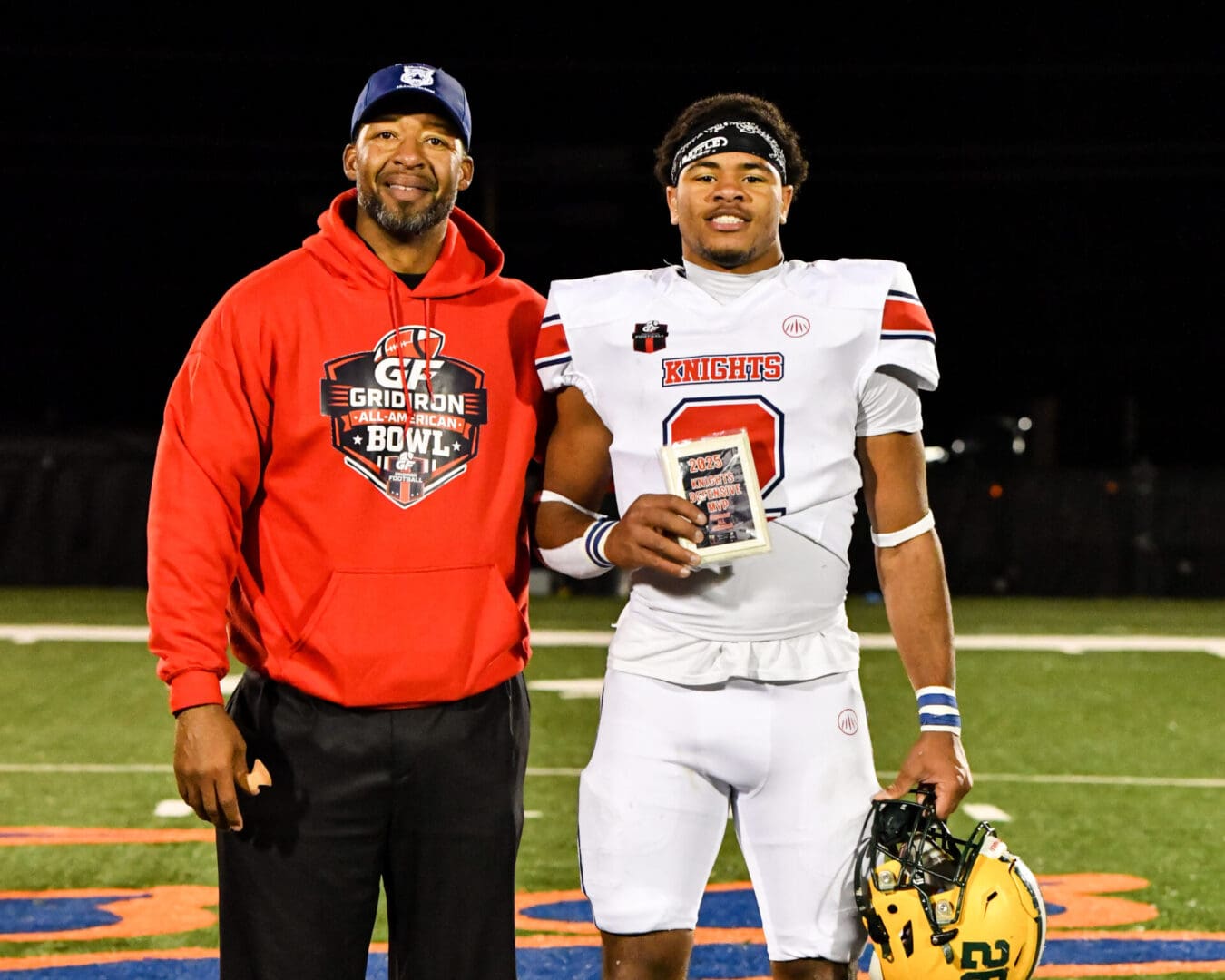 The Lions’ defense was quite dominant in their two games by shutting out the Tigers and the Knights in five quarters of action while pressuring the quarterback 12 times and sacking them six times throughout. Like the Lions’ offense, there were plenty of candidates to choose from including Escambia High School (Pensacola, FL) DT Andrion Battle, who had four tackles, 1.5 sacks, 1 TFL, 1 PBU, and 2 QB hurries, Jennings High School DT Nate Broussard, who had 1.5 sacks, Delhi High School DE Zion Hogan, who was nearly unblockable, linebackers like Greyson Dupre and Bryson Vaughn, who were all over the field, and defensive backs like Kendrick Cahee, Don Brooks, and Gerald Watson, who were excellent in coverage. However, in the end, the defensive MVP went to the Lions’ number one overall pick: DB Cayden Randall from Woodlawn High School in Baton Rouge, LA. The Southeastern Louisiana University signee made his impact felt throughout on special teams by laying the wood on two crushing hits. He also made plays on defense and even got a few wildcat snaps too. Leading the team in tackles with 4.5, Randall’s versatility, energy, and hard hitting ability was shone on the biggest stage. Winning the Defensive MVP award and having his dad Marcus Randall present him the award was just the cherry on top to a special day.