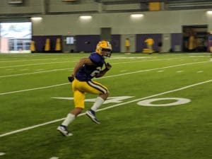 Cornerback Derek Stingley has been in the rotation with the first team since he got on campus. According to Coach Orgeron, “he’s further along than any player I’ve ever coached.” Stingley has a knack for the football, and is a phenomenal player. “We went right at him in the scrimmage, we threw a fade route to his side and he intercepted it on the first play.” The true freshman has been asked a great deal of and has even been returning punts during practice.