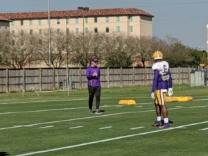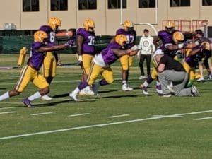 The offensive line had a very good scrimmage, under the watchful eye of second year line Coach James Cregg, the pass protection has improved phenomenally. Saahdiq Charles, Lloyd Cushenberry, and Chasen Hines were all mentioned for their efforts during the scrimmage. Coach Orgeron noted that with the addition of incoming five star commit Kardell Thomas, the offensive line will be getting even better.